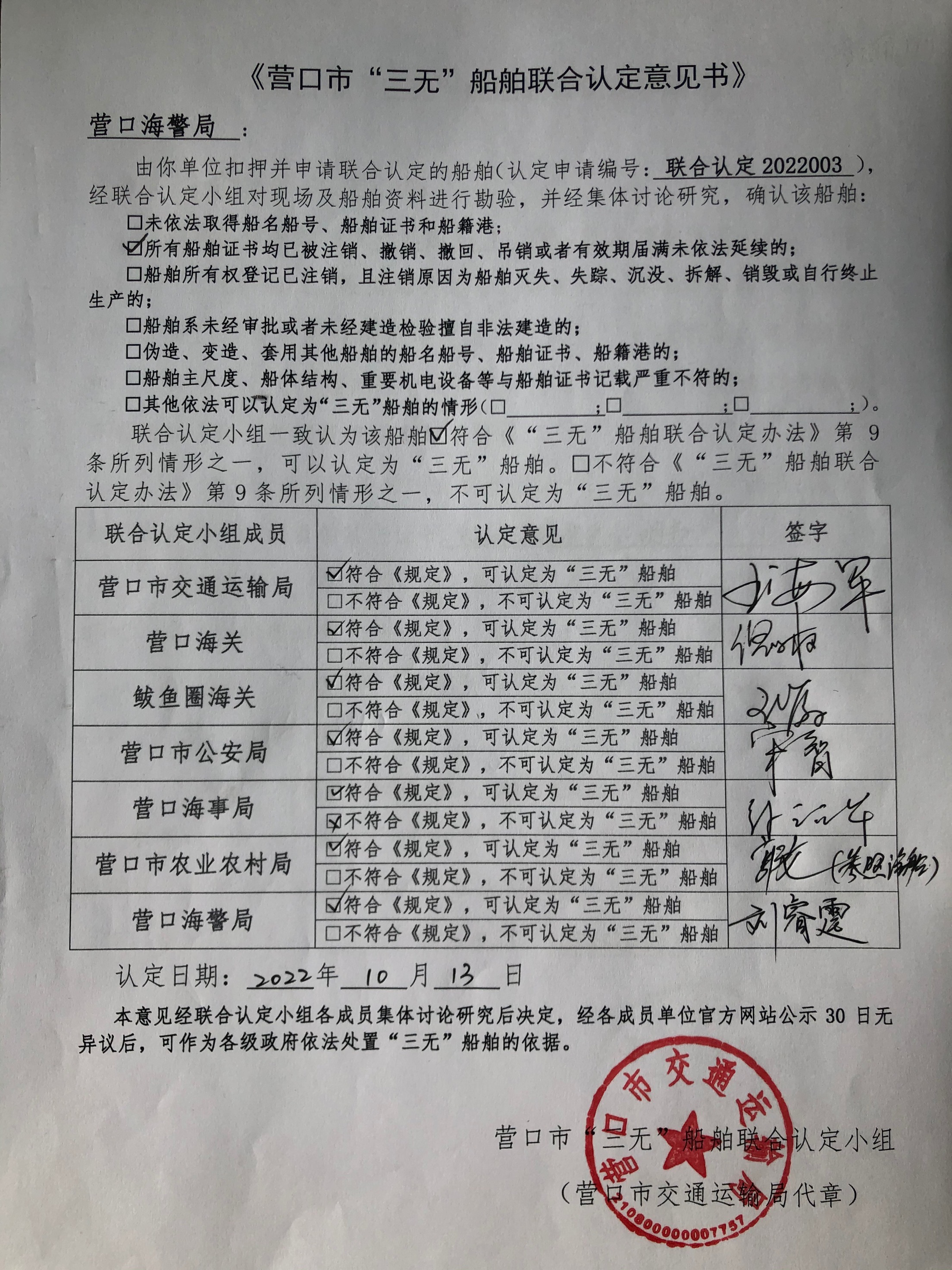《营口市“三无”船舶联合认定意见书》2022003